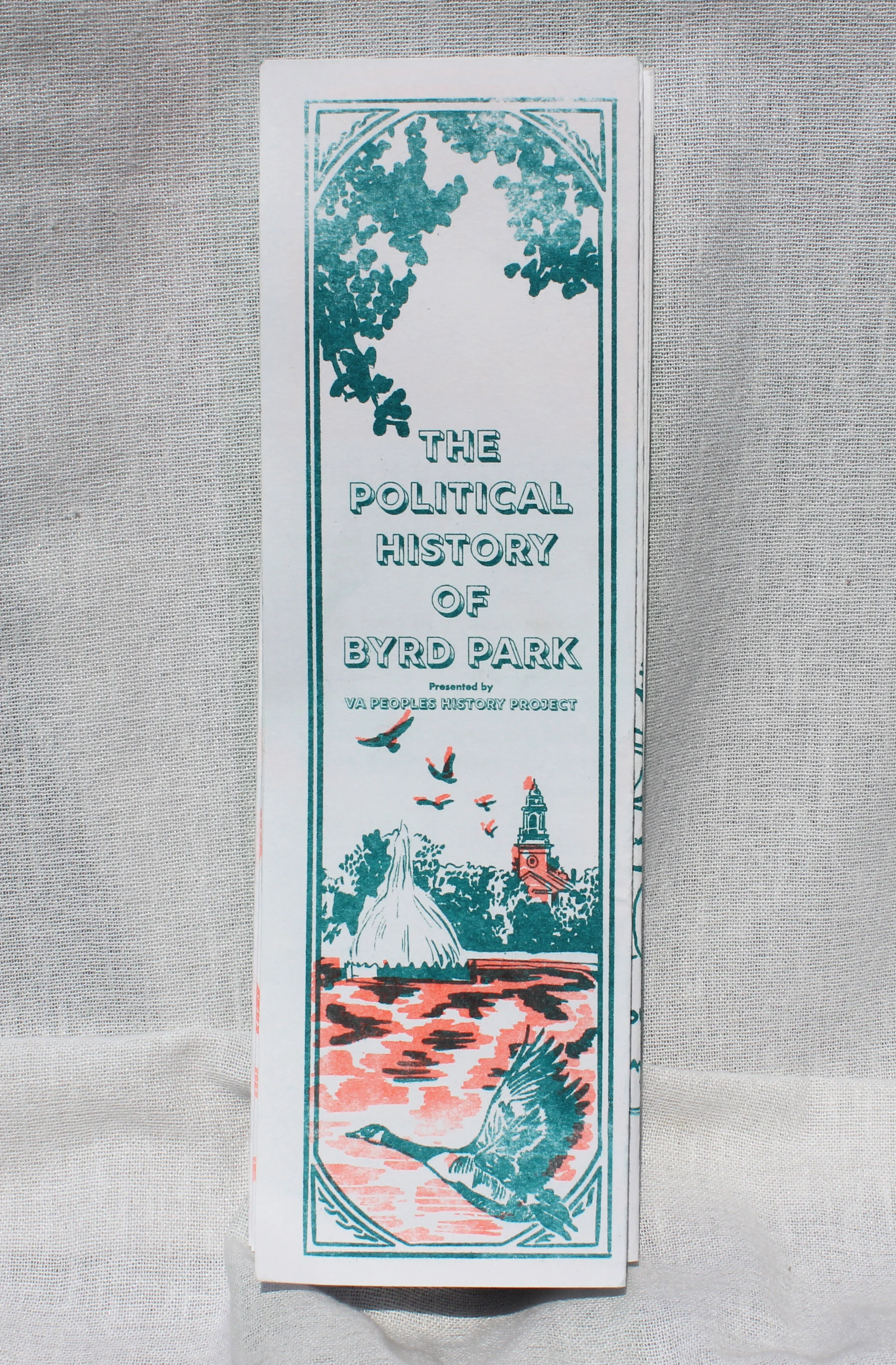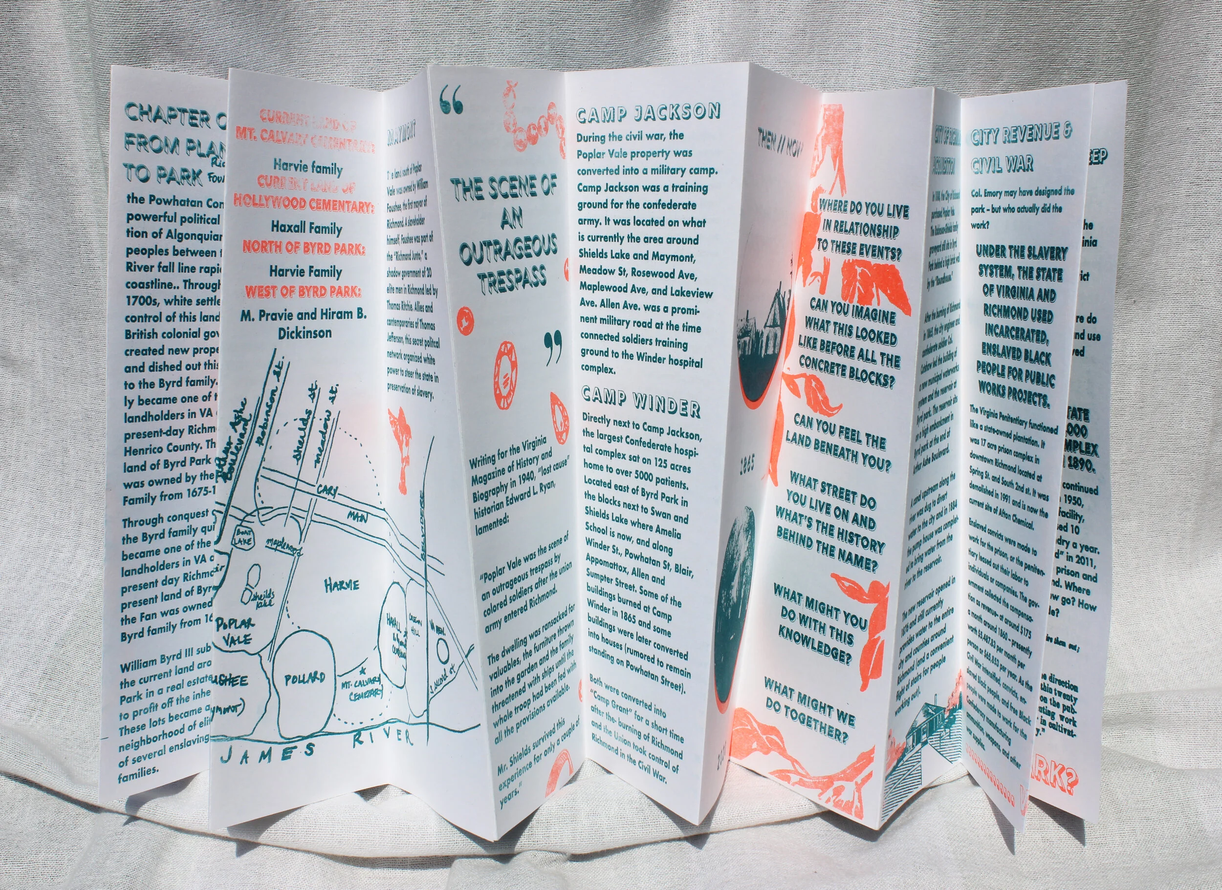 I edited, designed, and printed accordion-fold zines about the political history of Byrd Park in Richmond for the VA Peoples History Project, a political education project under the Highlander Research and Education Center.